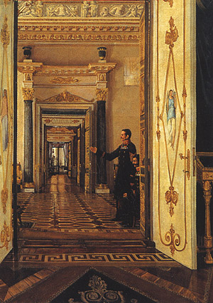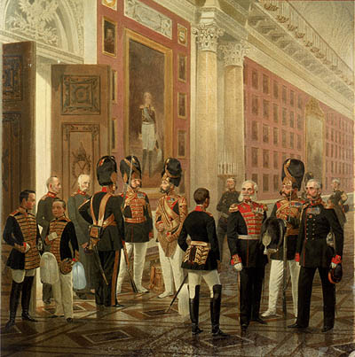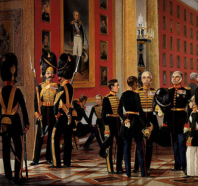 ![]() К.К. Пиратский. Дворцовые гренадеры и пажи в Военной галерее Зимнего дворца. 1848 г.