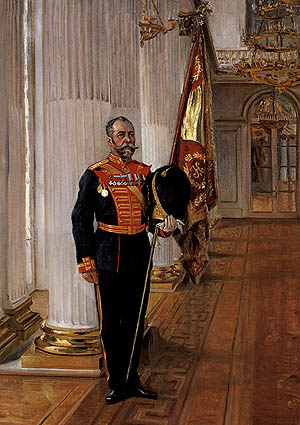 ![]() В.А. Поярков (1869-?). Знаменщик Роты Дворцовых Гренадер в Георгиевском зале Зимнего дворца. 1915 г.