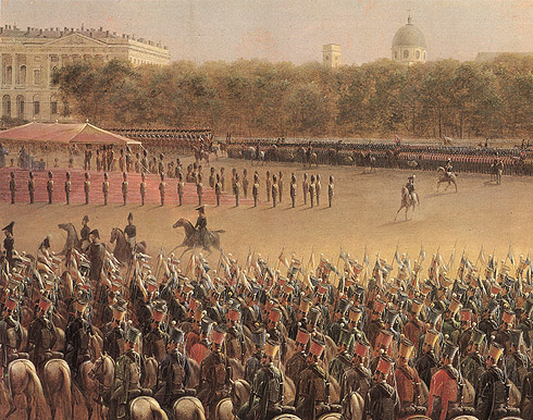 ![]() Парад на Царицыном лугу в Петербурге в 1831 г. Фрагмент.